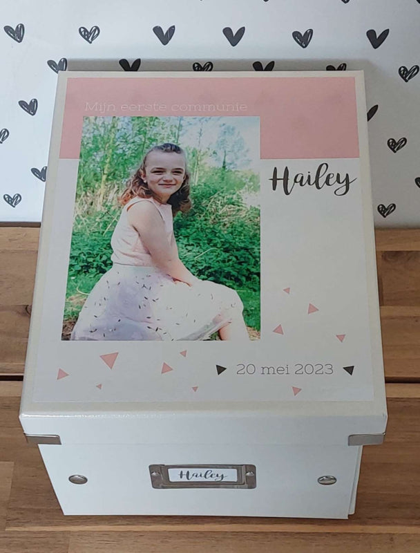 Communiedoos met naam en ''foto en kleine driehoekjes'' jongen of meisje