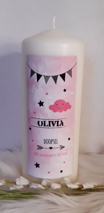 Doop- of geboortekaars met naam Vlaggenlijn roze