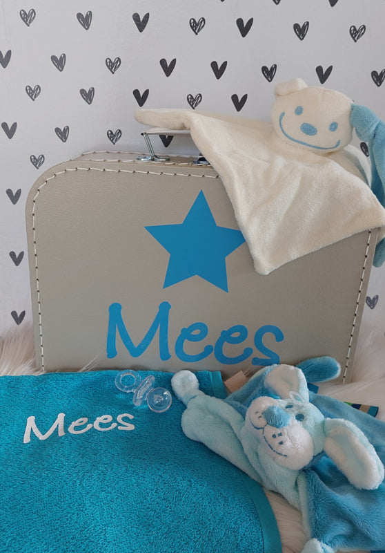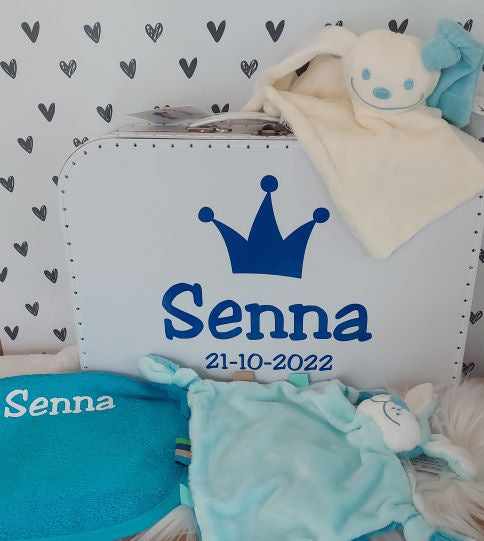extra gevuld kraamkoffertje met naam en diverse afbeeldingen -jongen