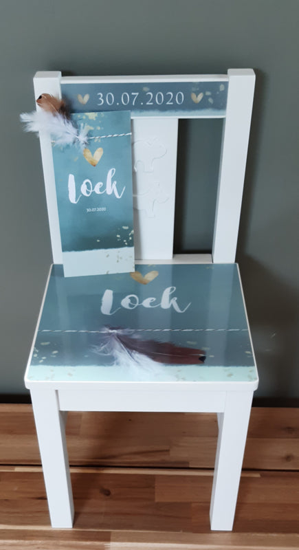 Schitterend kinderstoeltje met naam gemaakt van een geboortekaartje.