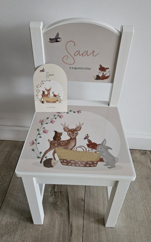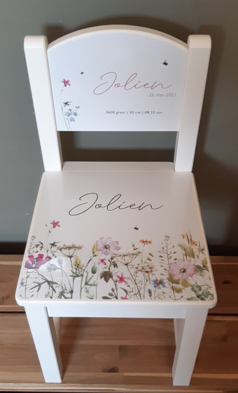 Schitterend kinderstoeltje met naam gemaakt van een geboortekaartje.