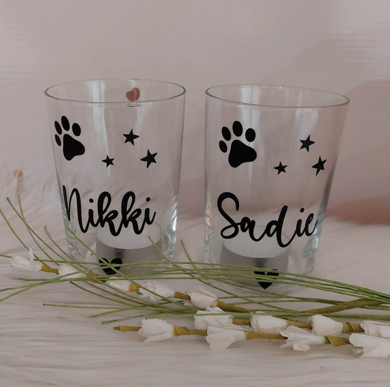 Glazen theelichthouder met naam en pootje huisdier