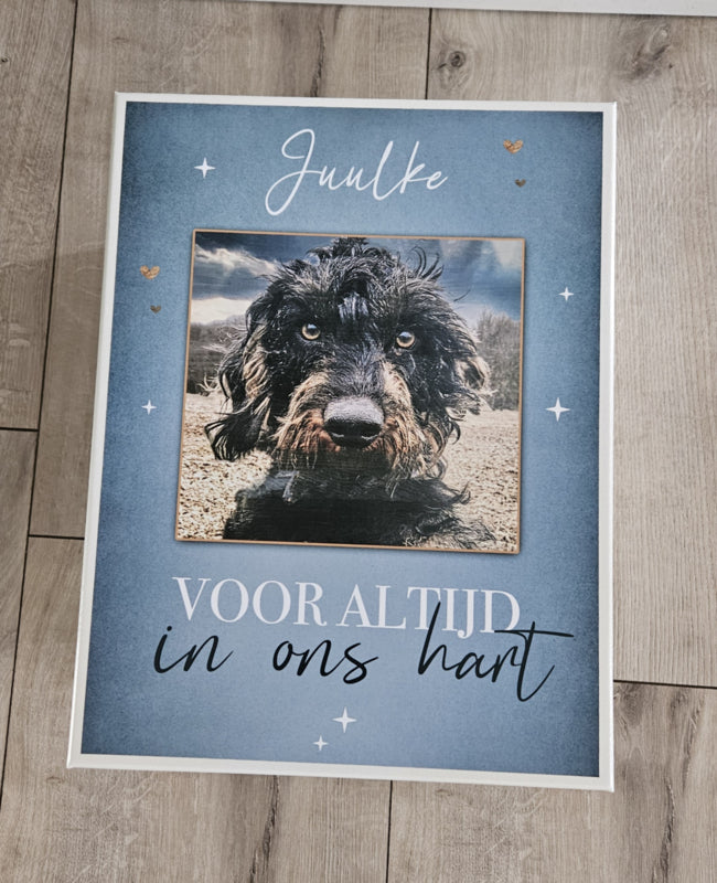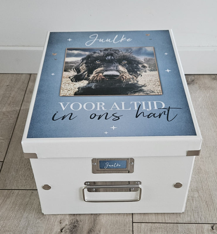 Mooie herinnerings/bewaardoos met naam en foto ter nagedachtenis aan een geliefd huisdier.