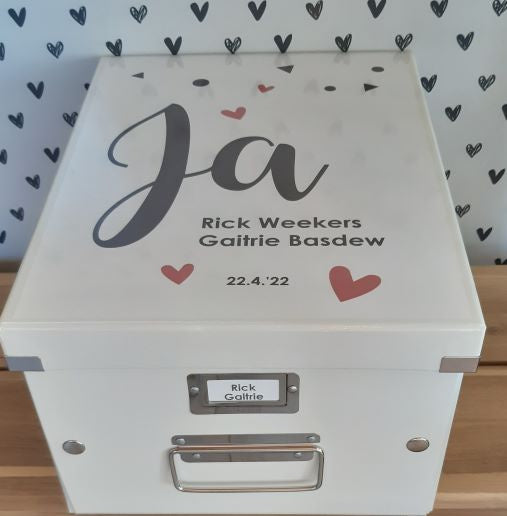 Leuke herinneringendoos voor jullie huwelijk, gemaakt om jullie gelukwensen en kleine cadeaus in op te bergen.