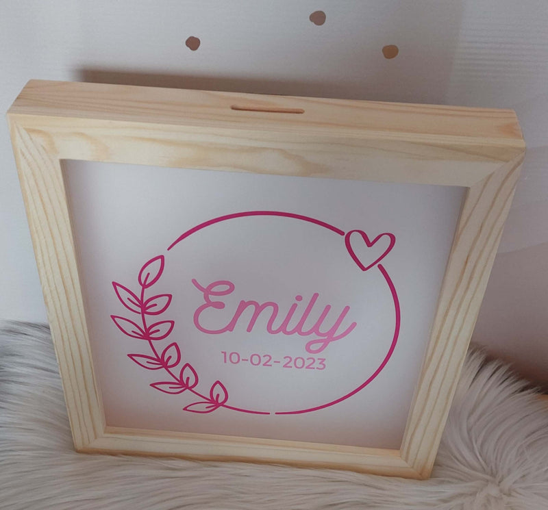 houten/ plexiglas spaarpot met naam bladkrans