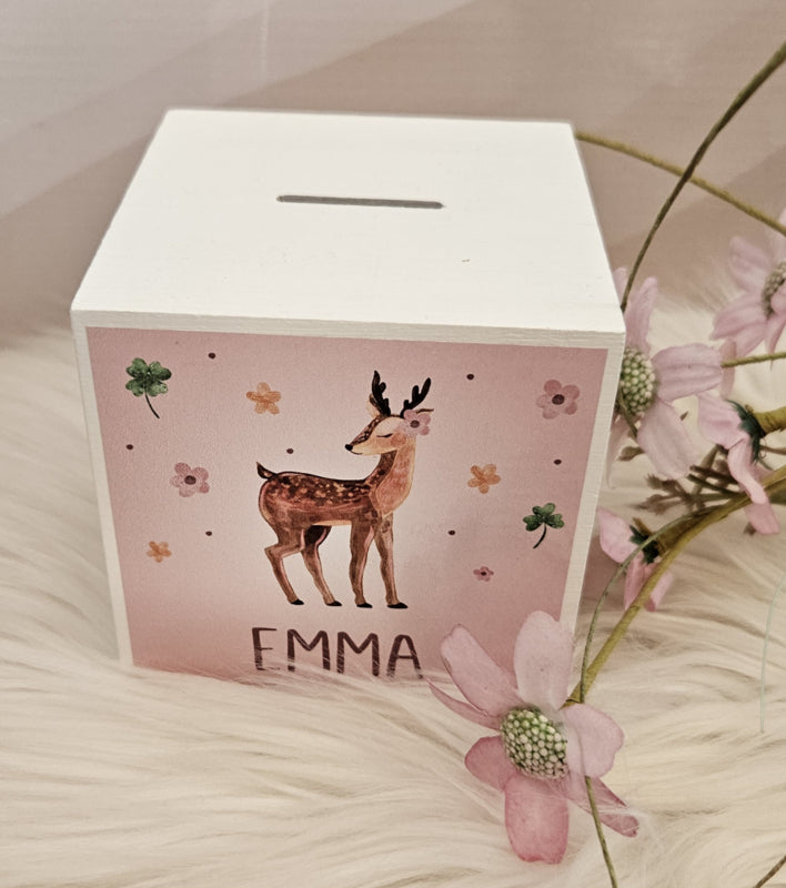 houten spaarpot met naam (en datum) en Hertje