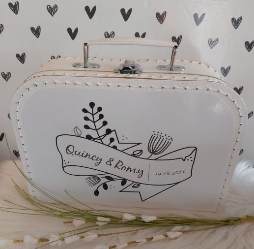 Een leuk koffertje om te geven als huwelijkscadeau met de namen van het bruidspaar en de huwelijksdatum.