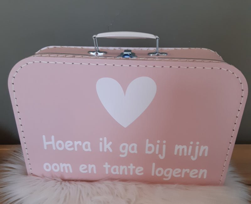 Leuk koffertje met de tekst ''hoera ik ga bij mijn oom en tante logeren''.