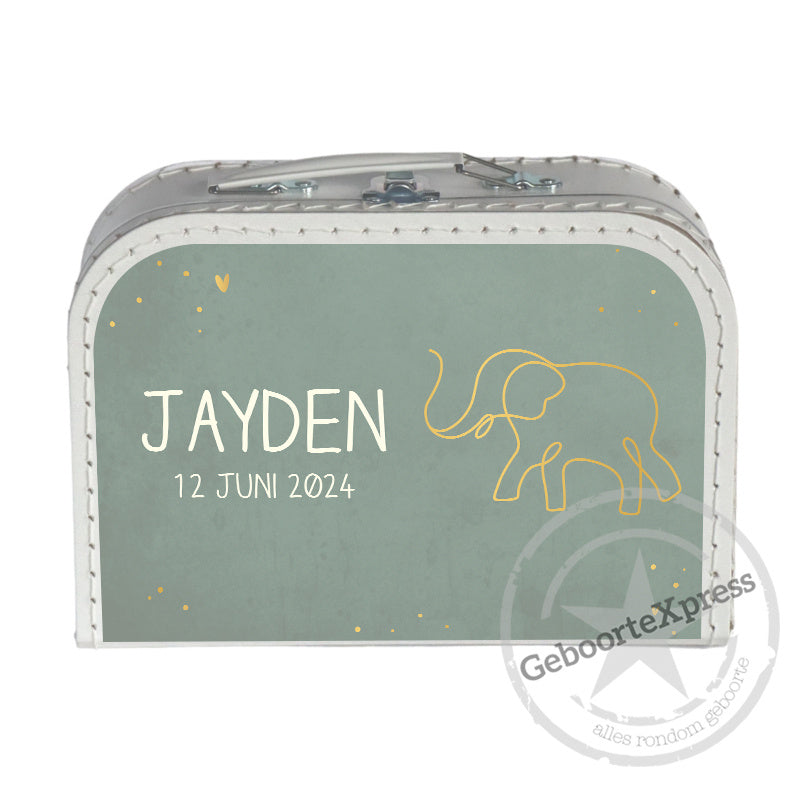 Dit leuke koffertje met naam en het silhouette van een olifant is verkrijgbaar in diverse kleuren en afmetingen.