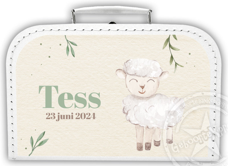 Dit leukekoffertje met naam en een schaapje is verkrijgbaar in diverse kleuren en afmetingen.