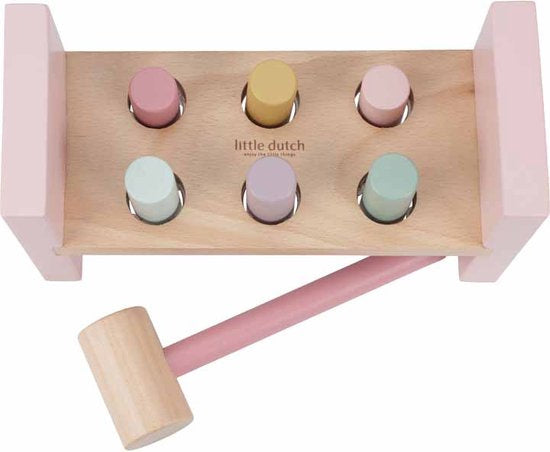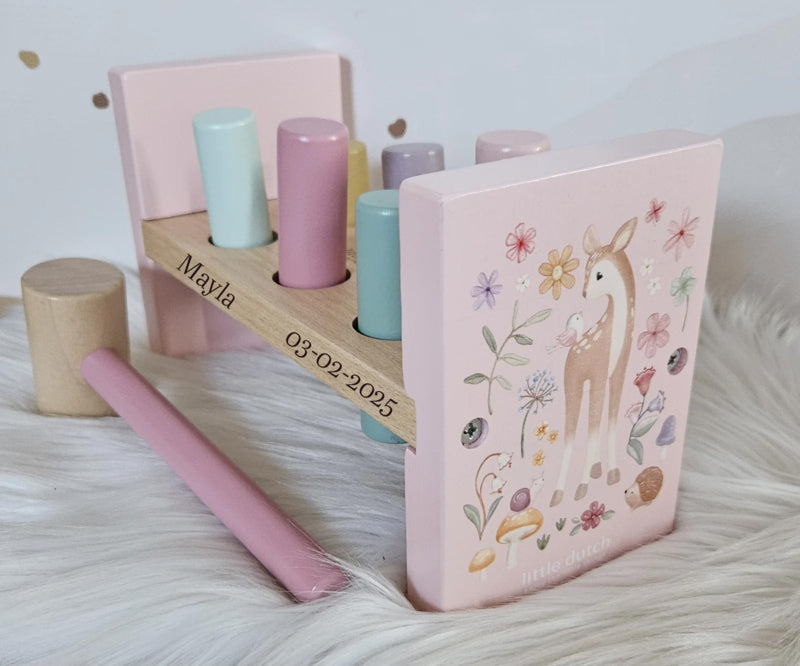 Gebruik de hamer om de 6 gekleurde staafjes in het houten hamerbankje te timmeren en verken de magie van Fairy Garden.