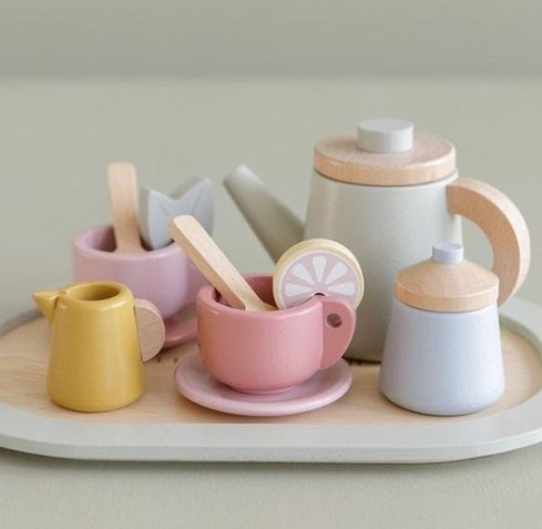 Met dit schattige houten theeservies kan je kleintje heerlijke kopjes thee schenken.
