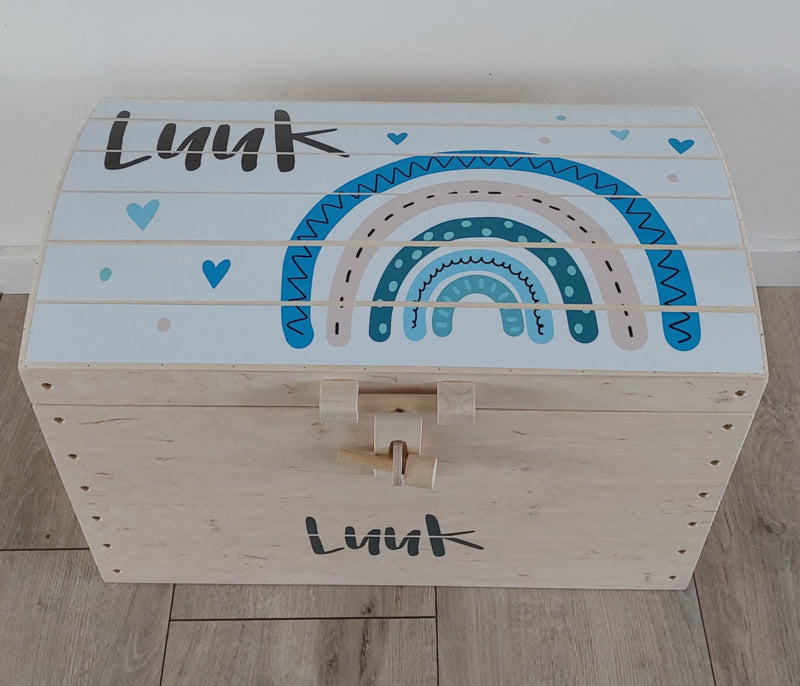 Naturel houten speelgoedkist met naam 'Regenboog' blauw