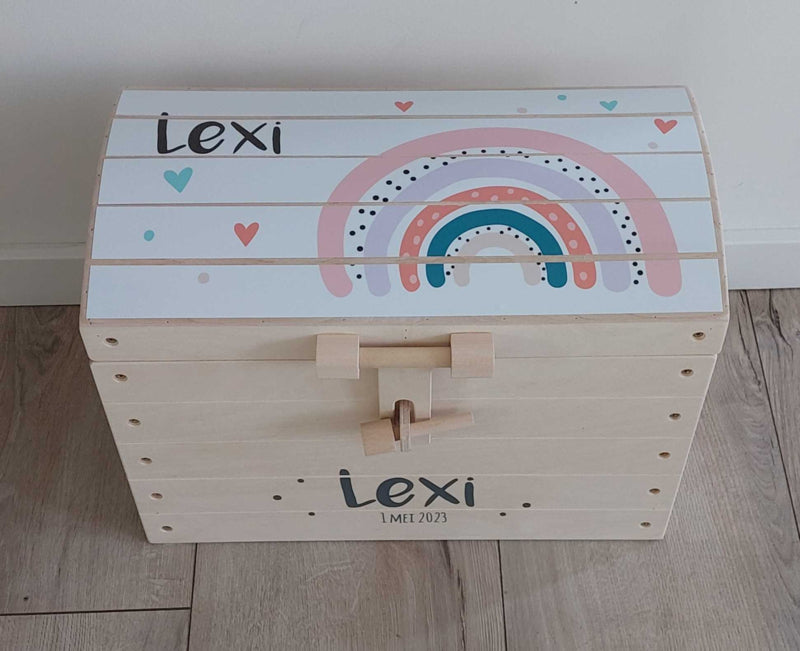 Naturel houten speelgoedkist met naam 'Regenboog' roze