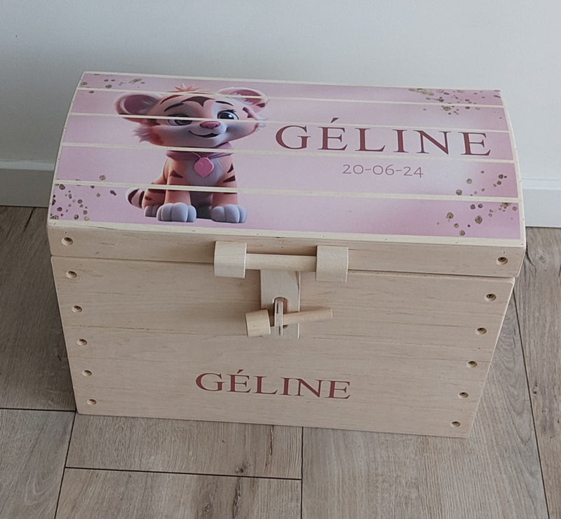 Naturel houten speelgoedkist met naam 'Schattig Tijgertje'