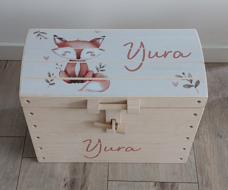 Naturel houten speelgoedkist met naam 'Schattig Vosje'