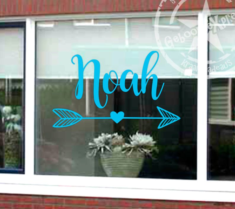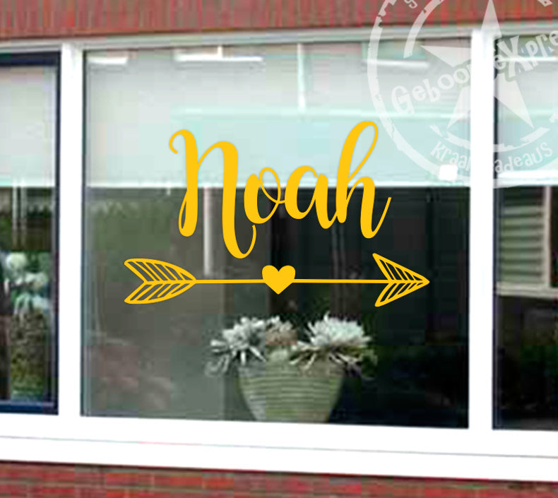 Raamsticker met naam en pijl.