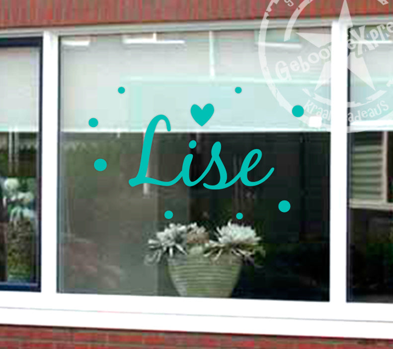 Raamsticker met naam stipjes en hartje.