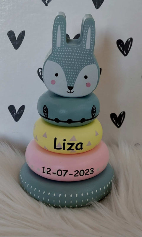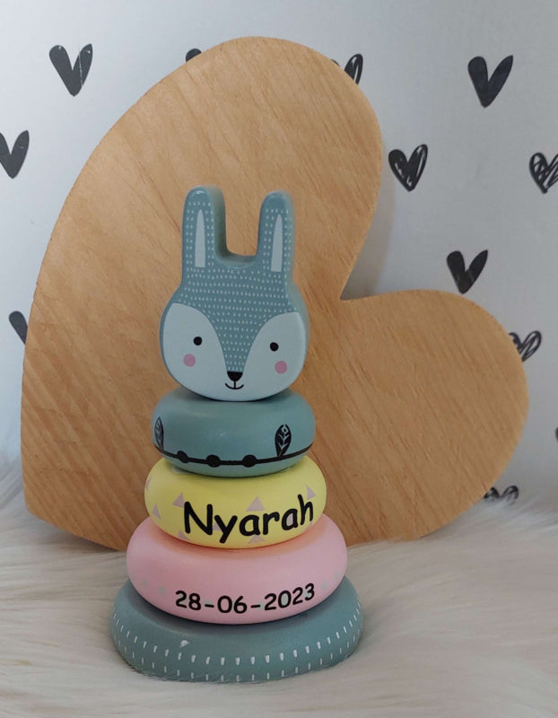 Deze kleine schattige houten stapel piramide in de vorm van een konijn is leuk en persoonlijk als je er de naam en geboortedatum op laat zetten.