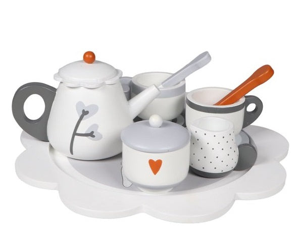Met dit vrolijke houten theeservies stimuleert het kindje zijn of haar fantasie en motoriek met het naspelen van een theekransje.